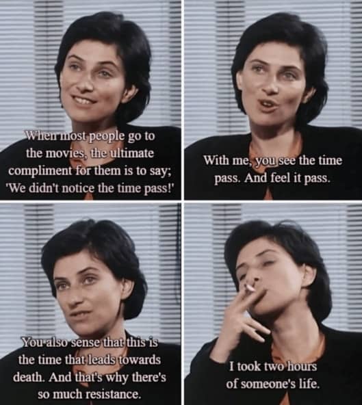In einem Interview sprach Akerman einst darüber, wie die Zeitstrukturen ihrer Filme den*die Zuschauer*in an seine*ihre eigene Vergänglichkeit erinnern und Akerman als Regisseurin die Macht behält, Lebenszeit zu rauben.